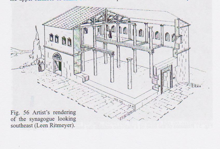 Aligned on an east–west axis, the synagogue at Khirbet Kanaf was constructed as a trapezoidal hall whose sides measure approximately 12.5 m (west), 13.25 m (east), 15.85 m (south), and 16.4 m (north). None of the original interior fittings—the stone pavement, benches, or the Torah shrine—survive; all were entirely destroyed. The building was first assigned to the third century CE, but numismatic evidence has revised this view. More than five hundred coins were recovered at the site, the majority identified. Of particular relevance are four coins deposited in the synagogue’s foundations. In addition, five coins belong to the periods of Theodosius II or Valentian III (425–450 CE), Marcian (450–457 CE), Leon I (457–474 CE), and two to Anastasius I (491–518 CE). Taken together, these finds indicate that construction should be placed at the beginning of the sixth century CE. The lack of seventh-century material suggests that the settlement at Kanaf was abandoned by the end of the sixth or the start of the seventh century CE. The site came to scholarly attention in 1895, when L. Oliphant recorded an Aramaic lintel inscription and several architectural fragments. A subsequent expedition in 1932, directed by E. Sukenik, documented most of the architectural remains; some were later subjected to vandalism. Sukenik identified portions of ancient walls and pavements and proposed that the synagogue’s main portal was located on the western façade. Later fieldwork consisted of four short excavation seasons conducted by Z. Ma’oz on behalf of the Israel Department of Antiquities and the Hebrew University of Jerusalem (1978–1980; 1985). Illustration credit: Reconstruction after Maoz 2011, p. 69; courtesy of Zvi Maoz; synagogues.kinneret.ac.il Further reading: - Maoz, Z.U. 1993. “Kanaf,” in The New Encyclopedia of Archaeological Excavations in the Holy Land, vol. 3, 847–850. - Milson, D.W. 2007. Art and Architecture of the Synagogue in Late Antique Palestine: In the Shadow of the Church, Leiden, 388–389. https://synagogues.kinneret.ac.il/synagogues/kanaf/
