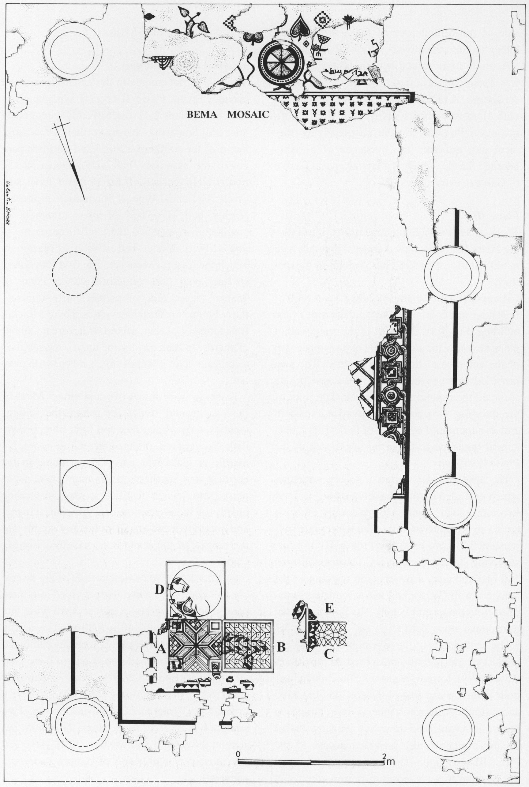 The synagogue at Kafr Misr evolved through three principal phases. Phase I can likely be placed between the third century CE and the end of the fourth, Phase II operated during the fourth and early fifth centuries CE, and Phase III represents the final arrangement, in use from the fifth into the early seventh century CE. Phase I occupied a rectangular structure measuring approximately 13.50 by 17.50 meters. Within this space, eight square column bases were set in two parallel rows aligned north–south. The interior was fitted with bench seating along all four walls and had a floor composed of flagstones and plaster. The building appears to have included two doorways, a bema, and a drainage channel. Ceramic finds recovered from the building included sherds as early as the first century CE, although no architectural remains from that date could be associated with the synagogue at this stage. The second phase largely retained the external aspect of the earlier construction. Internally, however, a permanent installation for the Torah ark was introduced, possibly screened by a curtain (parokhet) separating it from the congregational hall. During this period the earlier plastered flooring was replaced by mosaic. Portions of Phase II were preserved on the northern side of the central area of the assembly and were incorporated into the mosaic pavement of the final phase. In Phase III the complex assumed its definitive form. An apse of limestone and mortar, about 2.80 meters in internal diameter, was constructed on the southern side. The eastern entrance was sealed, and a new door, approximately 0.85 meters wide, was opened in the western wall, supplementing the principal entrance on the north. The central zone of the hall received a new mosaic floor, now only partially preserved; subsequent building activity heavily damaged all mosaic pavements. Near the bema, a mosaic panel measuring roughly 1.20 by 4.30 meters combined floral ornament, Jewish symbols, and fragments of an Aramaic inscription. Further reading: - Milson, D.W. 2007. Art and Architecture of the Synagogue in Late Antique Palestine. In the Shadow of the Church, Leiden, 411–416. - Onn, A. 1994. The Ancient Synagogue at Kafr Misr, Atiqot 25, 117–134. - https://synagogues.kinneret.ac.il/synagogues/misr/
