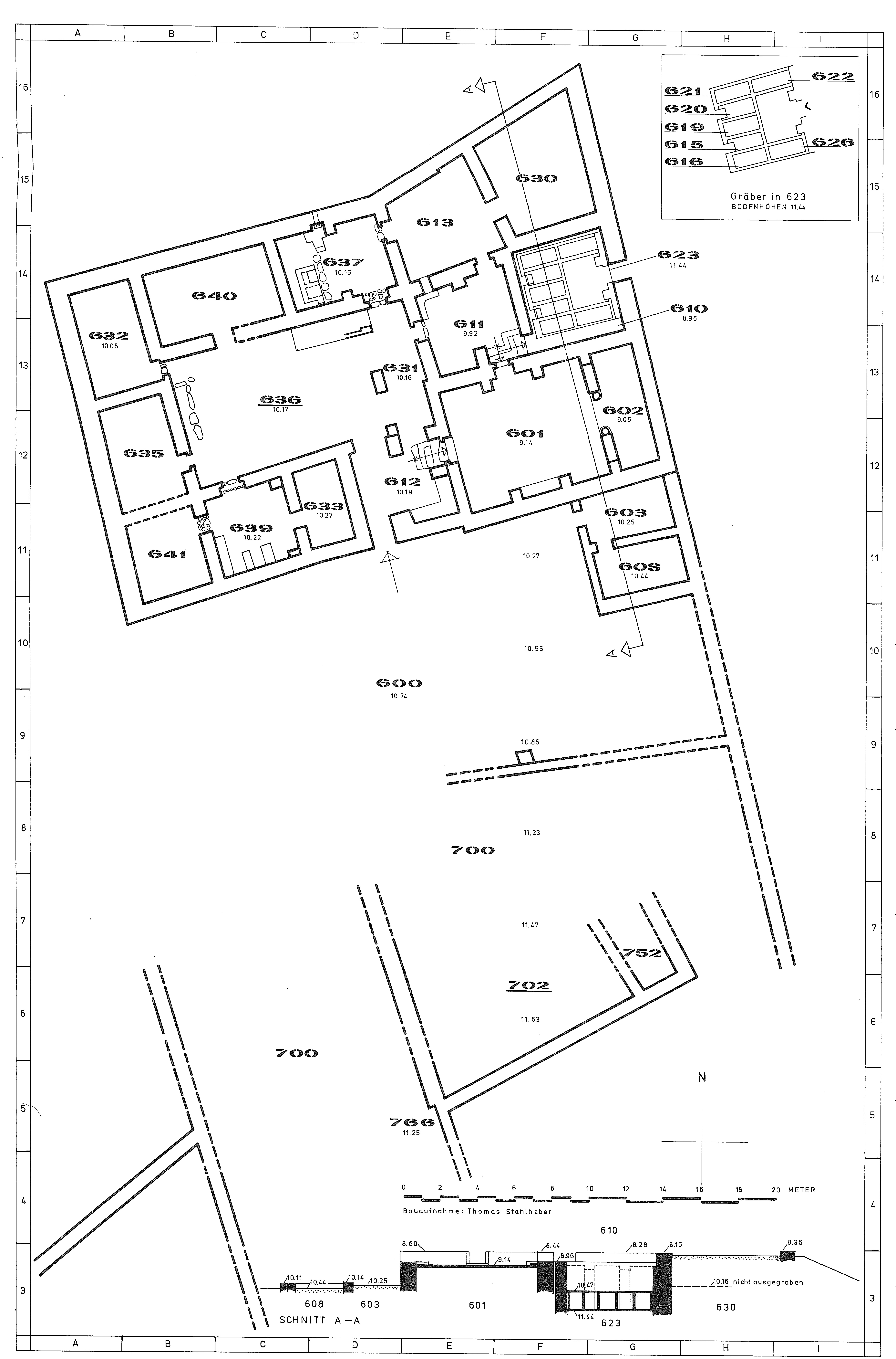 On the southwestern margin of Tel Masos (Area D) stands a monastic compound whose plan centers on a courtyard flanked by multiple rooms and a principal sanctuary. The chapel, placed in the southeastern sector and measuring approximately 10 by 6.5 m, was characterized by the excavators as exhibiting a Syrian stylistic idiom. Around the court, seven rooms line the western and northern sides, with four additional chambers along the east. In the northeastern corner of the courtyard, a room yielded two ovens together with domestic ceramics, leading to its identification as the kitchen. Immediately north of the chapel lies a burial chamber containing seven tombs. This space could be reached both from within the monastery and through an opening in the complex’s eastern wall. The graves were cut and originally sealed by stone slabs that have since weathered away. It is possible that walls adjacent to the chapel collapsed into this area, and that some inscribed elements originated from this fallen masonry. Finds related to Syriac script were recovered in successive excavation seasons. In 1974, fragments of plaster bearing Syriac letters were discovered within the crypt; they likely represent the remains of a memorial tablet (Ger. Totengedenktafel). The previous year, five stones inscribed with Syriac characters were collected from the debris of the two rooms adjoining the crypt and from the chapel itself, though their original positions and functions remain unknown. All of these inscriptions are fragmentary and poorly preserved, making them difficult to read. Duncan’s study (2008) of the monastery’s architectural and religious context concluded that the inscriptions do not allow a precise determination of the Byzantine complex’s affiliation. Whether the texts are East Syrian or West Syrian (Nestorian), they nevertheless indicate that the monastery’s inhabitants were not local. The building’s design and parts of its decorative program likewise point to non-local influences. The entire complex is roughly rectangular, measuring about 30 by 20 m. Source of images Fritz, V.; Kempinski, A. 1983: vol. I, p. 139, figs. 17–19; vol. III, Plan 25. Further references - Bar-Asher, M. 1977. Palestinian Syriac Studies. PhD thesis, Department of Linguistics, Hebrew University, Jerusalem [in Hebrew; unpublished], nos. 144–145. - Duncan, C. E. 2008. An investigation into the Geography, Theology, and Architecture of the Byzantine Monastery at Tel Masos. MA thesis supervised by Jodi Magness, University of North Carolina at Chapel Hill. - Figueras, P. 1995. Monks and Monasteries in the Negev Desert, Liber Annuus 45, 401–450. - Fritz, V.; Kempinski, A. 1983. Ergebnisse der Ausgrabungen auf der Hirbet el-Msas (Tel Masos) 1972–1975: Teil I: Textband. Teil II: Tafelband. Teil III: Pläne. Wiesbaden: Harrassowitz.