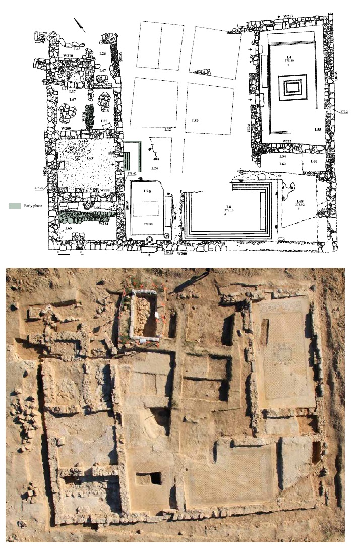 An earlier ecclesiastical phase, either a church or a monastic establishment, preceded the later complex at this location. Its remains lie beneath the western service wing, among them a mosaic in Room 63, and are dated to the late fourth or fifth century CE. Above these earlier structures, a sixth-century monastery measuring approximately 28 × 20 m was erected on an east–west alignment. The plan, progressing from west to east, comprised a west wing, an open central courtyard (L59), a narthex (L7), a prayer hall (L8), and a refectory (L4). Construction employed flint and chalk, with small stones embedded in a mud-based mortar. Two entrances to the complex were identified; one pierced the southern wall and opened into the narthex, which functioned as a vestibule. This space was paved with a continuous mosaic and carried a bilingual inscription in Greek and Christian Palestinian Aramaic (CPA). At the core of the building lay the open, beaten-earth courtyard (L59). The northern monastery wall is almost entirely lost, a condition likely caused by the collapse of a cistern beneath that sector. East of the narthex stood the prayer hall (L8; 5 × 8 m). Although the narthex provided the principal approach, a secondary access may have connected the prayer hall with the courtyard to the north. In the eastern part of the hall was a bema (L68), raised about 15 cm above the floor and separated by a chancel screen. A Greek inscription giving the date of the monastery’s construction was found within the mosaic pavement of this hall. North of the prayer hall and east of the courtyard lay the refectory (5.5 × 10 m), whose mosaic floor contained another Greek inscription set at its center. Additional rooms that may have served as monks’ cells have not survived; alternatively, the monks may have lived in the nearby village. Site plan and image source: Varga, Talgam 2023: 366–367, plan 1 and fig. 2. Further reading: Ustinova, Y. Greek Inscriptions from the Byzantine-Period Monastery at Ḥura. ‘Atiqot 110 (2023): 385–393. Varga, D. Hura, Nahal Shoqet, Preliminary report. Hadashot Arkheologiyot 127 (2015). http://www.hadashot-esi.org.il/report_detail.aspx?id=24838&mag_id=122 Vainstub, D., Sokoloff, M. and Varga, D. A New Christian Palestinian Aramaic Inscription in a Mosaic Pavement at Ḥura, Israel. Le Muséon 129, no. 3–4 (2016): 279–284. Varga, D. and Rasyuk, A. The Byzantine Monastery at Ḥura in the Northern Negev. Qadmoniot 50, no. 154 (2017): 109–118 (in Hebrew). Varga, D., Talgam, R. A Byzantine-Period Monastery at Ḥura. ‘Atiqot 110 (2023): 365. SEG 65 1766–1769. Negev (area of: Ḥura). Christian mosaic building inscriptions, 6th cent. A.D. A Digital Corpus of Early Christian Churches and Monasteries in the Holy Land: https://dig.corps-cmhl.huji.ac.il/epigraphicals/%E1%B8%A5ura-%E1%B8%A5orvat-%E1%B8%A5ura-khirbet-%E1%B8%A5ura-monastery