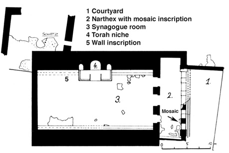 Two inscriptions are attested: CIIP IV 3869 on the northern wall, west of the Torah shrine, and CIIP IV 3868, a mosaic embedded in the narthex floor. The synagogue followed a broad-house plan organized as a single hall and aligned along an east–west axis. The Torah shrine was set against the north wall, with the bema positioned directly in front of it. Image source: CIIP IV 3868, fig. For further reference: CIIP IV 3868–3869 Yeivin, Z. 1993. “Eshtemoa,” in The New Encyclopedia of Archeological Excavations in the Holy Land, 423–426.
