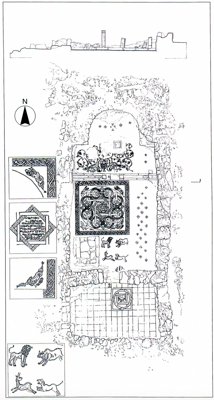 An elaborate mosaic program dominates the church interior, combining geometric motifs with the Greek letters alpha and omega, and featuring animals such as a peacock and an eagle, as well as a lion confronting an ox and a dog pursuing a gazelle. The same mosaic pavement carries an inscription in Christian Palestinian Aramaic. Architecturally, the complex comprises a vestibule and nave, a chancel screen, and an elevated presbytery terminating in an apse. The building belongs to the latter half of the sixth century and was restored at a later date. Plan: published in Piccirillo and Qudah 2003, p. 310, fig. 2. Further reading: - Hoyland, R. 2010. “Mount Nebo, Jabal Ramm, and the status of Christian Palestinian Aramaic and Old Arabic in Late Roman Palestine and Arabia,” in M.C.A. Macdonald (ed.), The Development of Arabic as Written Language, Oxford, 29–46. - Piccirillo, M.; Qudah, Z. 2003. “L’eremitaggio nel Wadi Rajib Sulla Montagna di Ajlun in Giordania,” in G.C. Bottini, L. di Segni, and L.D. Chrupcala (eds.), One Land–Many Cultures. Jerusalem: Franciscan Printing Press, 309–316. - Puech, E. 2003. “L’inscription christo-palestinienne du Ouadi Rajib-Ajloun et de nouvelles inscriptions christo-palestiniennes de Jordanie,” in G.C. Bottini, L. di Segni, and L.D. Chrupcala (eds.), One Land–Many Cultures. Jerusalem: Franciscan Press, 317–325.