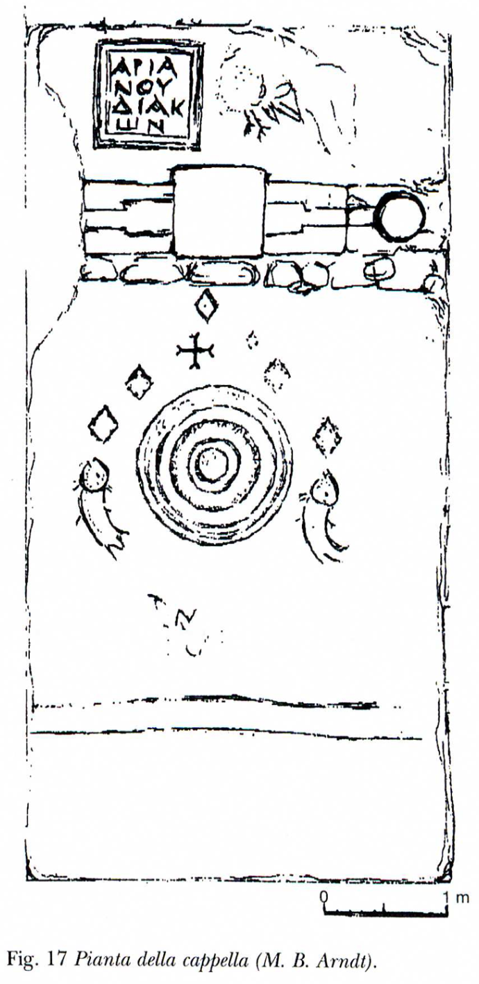 The fortress was erected on the footprint of an earlier monastic establishment. The chapel has been subject to multiple maintenance campaigns and retains mosaic ornamentation with geometric patterns and animal imagery, notably eagles and fish. Traces of iconoclastic defacement indicate that these decorations predate the eighth century. Plan based on: Piccirillo and Qudah 2003, p. 315, fig. 17. Further reading: Piccirillo, M., and Qudah, Z. 2003. “L’eremitaggio nel Wadi Rajib Sulla Montagna di Ajlun in Giordania,” in G.C. Bottini, L. di Segni, and L.D. Chrupcala (eds), One Land–Many Cultures. Jerusalem: Franciscan Printing Press, pp. 309–316.