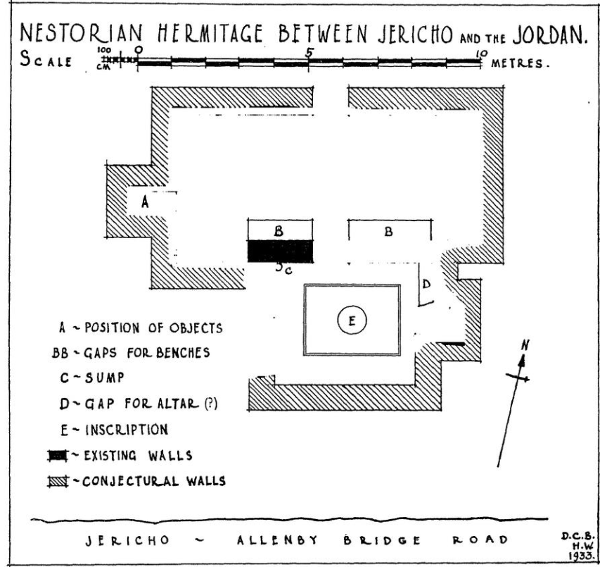 Putative Nestorian hermitage In 1933, remains of a small monastic establishment were identified between Jericho and the Jordan River, approximately 60 meters beyond the 42-kilometer marker on the Jericho–Allenby Bridge road. The complex comprised a large residential chamber and a more modest worship space. The southern room functioned as the chapel, furnished with an altar at its eastern end; at the center of this room’s mosaic floor a dedicatory inscription was set. The historical background of this community in the Jordan Valley is not documented. It was, however, very likely associated with the Nestorian episcopal see of Jerusalem. The argument for a Nestorian affiliation was advanced by H. Stephan, who based his case on a Syriac inscription incorporated into the mosaic pavement and published his conclusions in “A Nestorian Hermitage between Jericho and the Jordan.” Further reading: Baramki, D.C. - Stephan, H."A Nestorian Hermitage between Jericho and the Jordan", in Quarterly of the Department of Antiquities in Palestine 4 (1935), pp. 81-86. Hirschfeld, Y., "Judean Desert, Survey Map (Map 106)", Excavations and Surveys in Israel 2 (1983): 58-59. Fiey, J. M., "Rabban Bûya de Shaqlâwâ et de Jéricho", Proche-Orient Chrétien 33 (1983): 34-38.