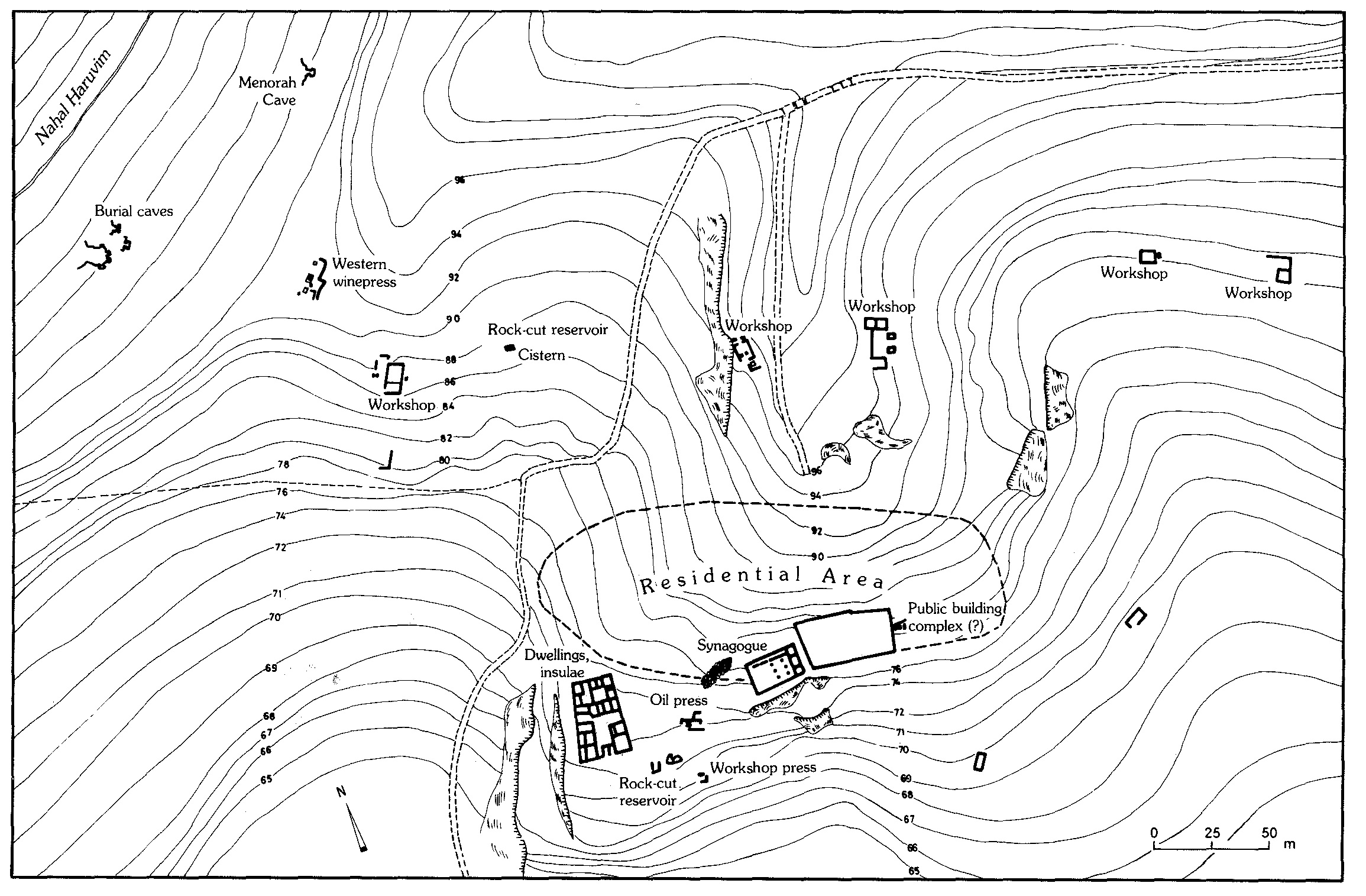 Research at Kribet Sumaqa (Horvat Sumaqa) began in the early twentieth century, when H. Kohl and C. Watzinger carried out a small-scale excavation of the synagogue. On the basis of this limited fieldwork, they proposed a reconstruction of the structure’s layout and overall size, relying primarily on comparisons with Galilean synagogues rather than on evidence uncovered in situ. Excavations resumed between 1983 and 1991 under the direction of Shimon Dar on behalf of Bar-Ilan University. The site represents a Jewish village on the Carmel range, approximately 2.5 km south of Daliyyat el-Karmil. Its remains occupy a modest ridge measuring roughly 200 meters in length and lying at an elevation of about 350 meters above sea level. The name Sumaqa reflects an Aramaic term for the shrub known in Hebrew as “og habursaqa'im” (tanner’s sumac), a plant used into modern times as a source for spices and medicinal preparations and in leather processing. Plan source: Dar 1993: 1412. Further reading: Dar, S. 1999. Sumaqa - A Roman and Byzantine Jewish Villge on Mount Carmel; Israel. BAR International Series 815, Oxford, (non vide). Milson, D.W. 2007. Art and Architecture of the Synagogue in Late Antique Palestine. In the Shadow of the Church, Leiden, 402-404.